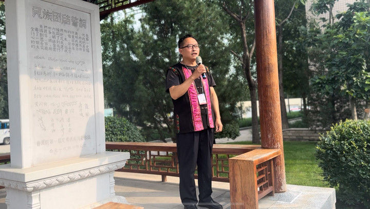 在中央民族干部學院石榴園,來自云南普洱的民族團結誓詞碑后人代表羅宗成向參觀團成員講述誓詞碑的故事。新華每日電訊記者劉小草攝