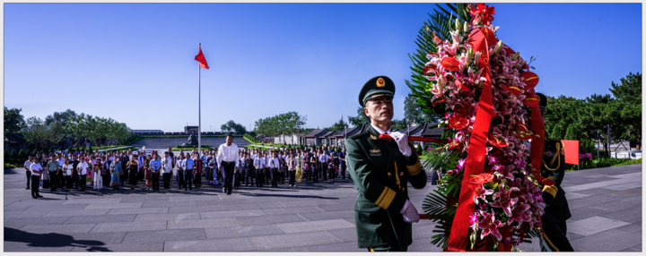 6日,參觀團成員們身著盛裝,列隊肅立,在中國人民抗日戰爭紀念館前向抗日英烈敬獻花籃,寄托對英烈的深切緬懷。