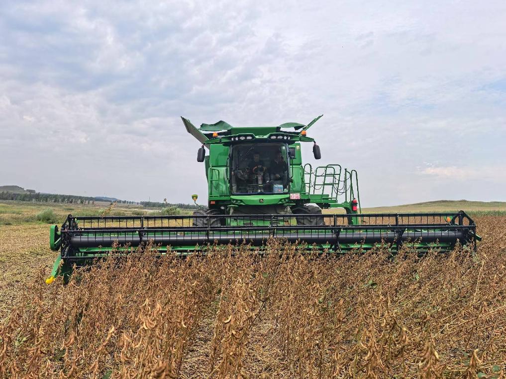 在黑龍江省七臺河市勃利縣恒山玉米專業合作社的一處地塊,一臺臺大型收割機往來穿梭,一排排飽滿的大豆植株被精準卷入機身,金黃的豆粒隨即通過出糧口涌入運糧車。