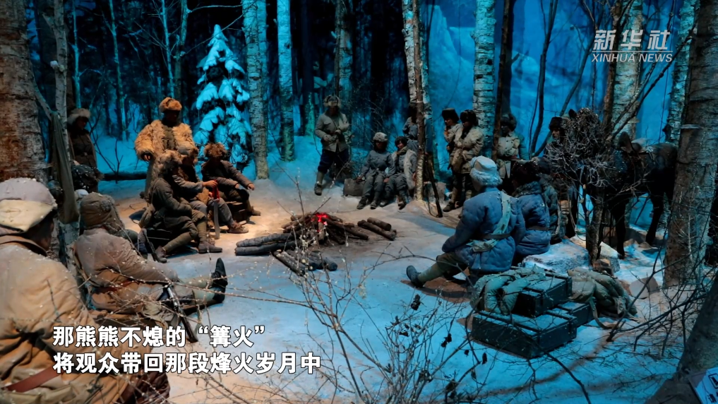 “九·一八”歷史博物館內,抗聯戰士密林宿營地的模擬場景吸引觀眾駐足,那熊熊不熄的“篝火”,將觀眾帶回那段烽火歲月中。