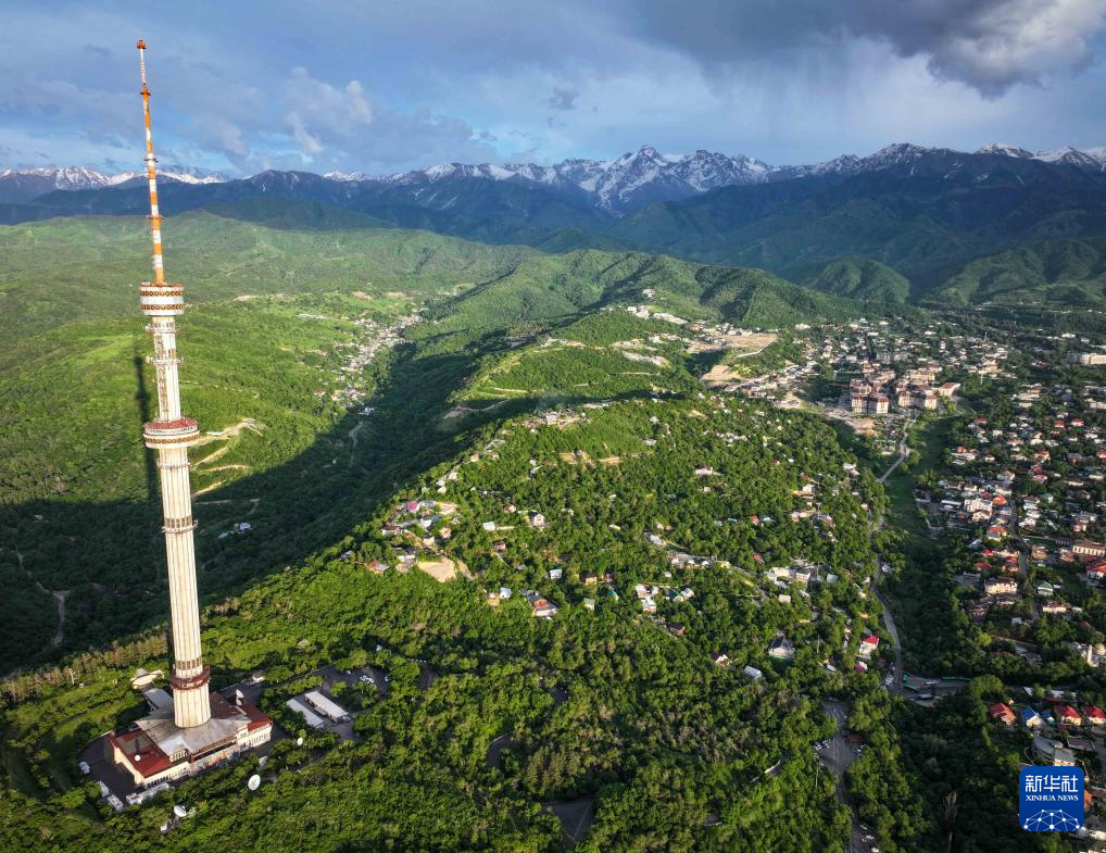 這是5月13日在哈薩克斯坦阿拉木圖拍攝的科克托別山和科克托別電視塔(無人機照片)。新華社記者 李任滋 攝