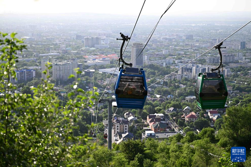 5月13日,游客在哈薩克斯坦阿拉木圖的科克托別山乘坐纜車。新華社記者 李任滋 攝