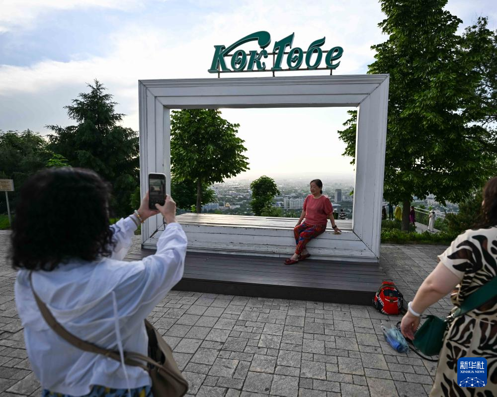 5月13日,中國游客在哈薩克斯坦阿拉木圖的科克托別山游玩。新華社記者 李任滋 攝