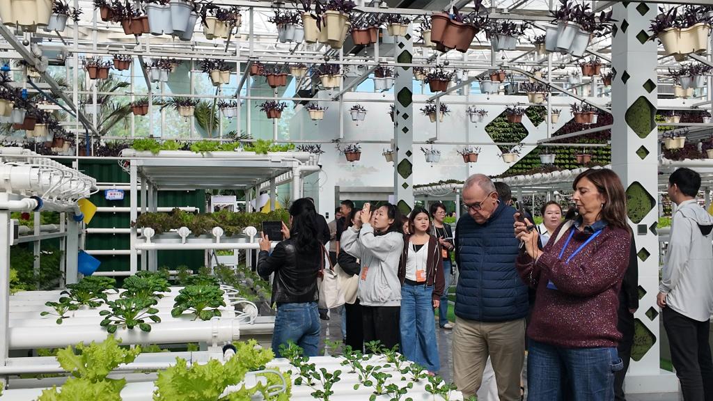 走進昌吉新疆農業博覽園內的垂直農業展示區、葉菜工廠示范區和果菜工廠示范區,目睹無土栽培、無人機灌溉、光合作用智能調控等一系列農業高科技應用為作物“量身定制”生長環境,參訪議員們紛紛拍照記錄。