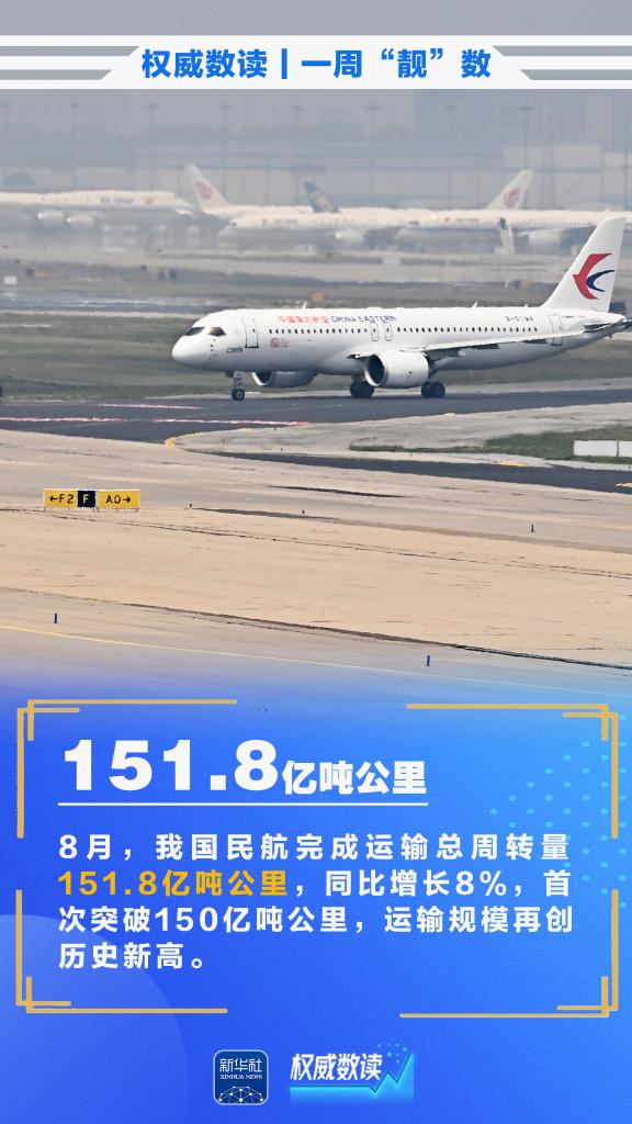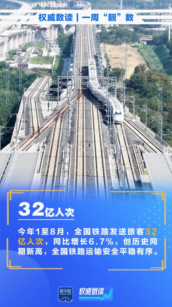 8月我國民航完成運輸總周轉量151.8億噸公里,運輸規模再創歷史新高;今年前8個月全國鐵路發送旅客32億人次,同比增長6.7%,創歷史同期新高;2024年全國優良天數比例達到87.2%,比2020年上升2.4個百分點……本周這些數據,最值得關注!