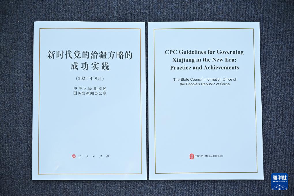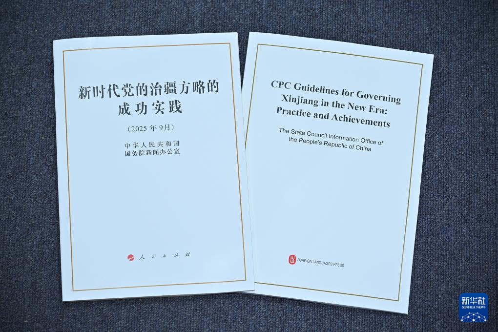 9月19日,國務院新聞辦公室在北京舉行新聞發布會,發布《新時代黨的治疆方略的成功實踐》白皮書,中央宣傳部副部長王綱,新疆維吾爾自治區黨委副書記、自治區主席艾爾肯·吐尼亞孜,新疆維吾爾自治區黨委常委、自治區常務副主席陳偉俊,新疆維吾爾自治區黨委常委、宣傳部部長王建新出席,介紹白皮書有關情況并答記者問。這是《新時代黨的治疆方略的成功實踐》白皮書。新華社記者 李鑫 攝