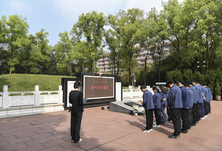 中鐵建工集團重慶東站項目部職工在重慶歌樂山烈士陵園緬懷革命先烈(2024年3月28日攝)。新華社記者 王全超 攝