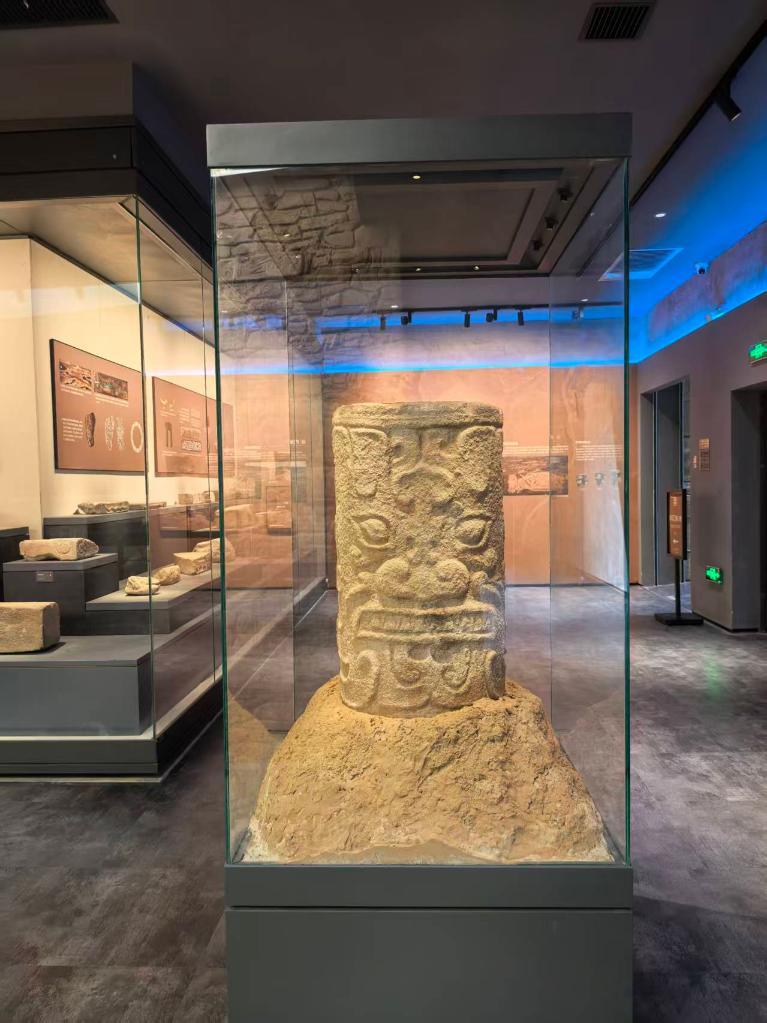 珍藏于石峁博物館的柱體雙神面大石雕。新華社記者張京品 攝