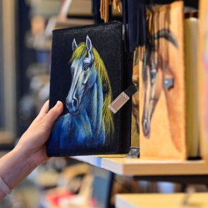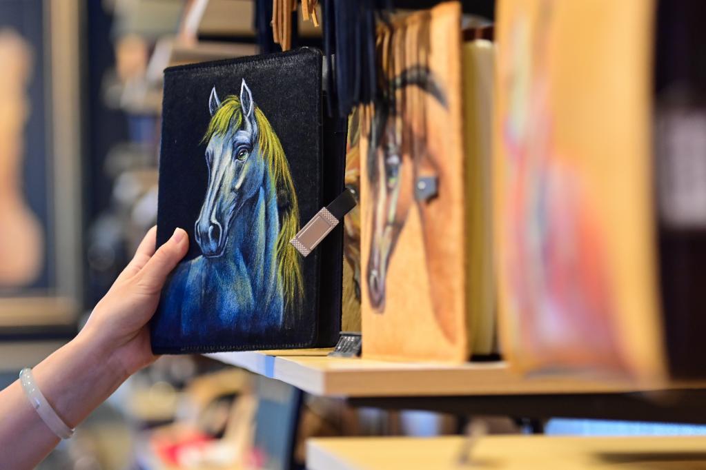 “伊犁是‘天馬之鄉’,我們在皮毛一體的馬皮上進行手工繪畫,每幅圖案都是獨一無二的,讓非遺與旅游深度融合?!钡觊L茹柯耶·艾散介紹,店鋪還開發出馬毛筆記本、首飾等文創衍生品,深受年輕人喜愛。