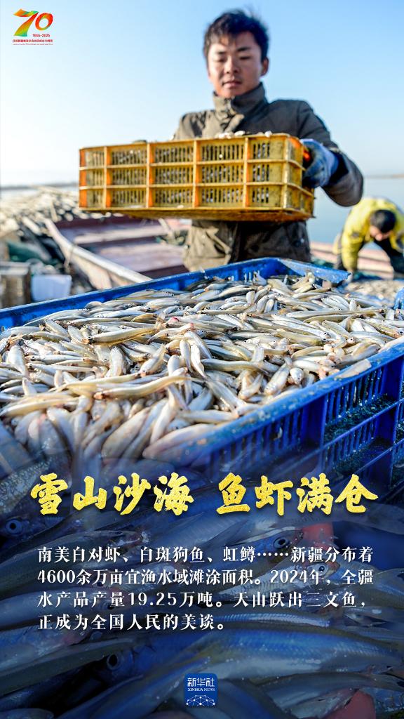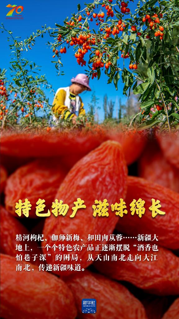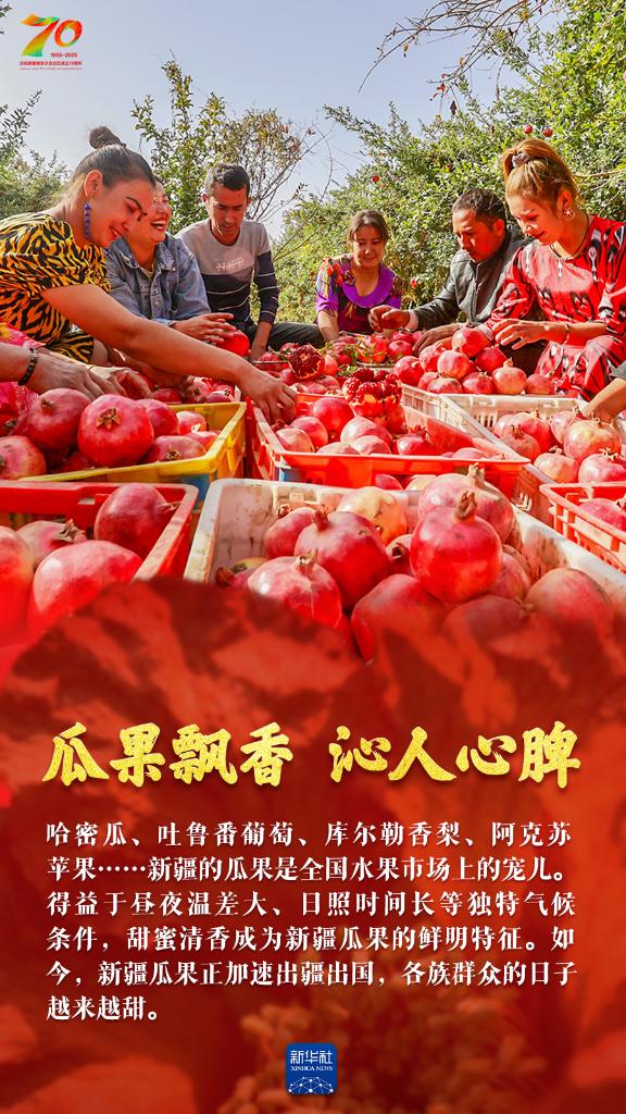 正是豐收好光景,天山南北倉廩實。今年是新疆維吾爾自治區成立70周年,70年來新疆農業生產發生了翻天覆地的變化:人均口糧從不足200公斤到糧食單產躍居全國第一;棉花占全國總產量的比重超過九成;離海最遠的新疆成為多種海鮮出口地;皮亞曼的石榴、吐魯番的葡萄、庫爾勒的香梨、阿克蘇的蘋果……更是甜醉了全國人民的味蕾。讓我們跟隨這組海報,領略豐收里的大美新疆。