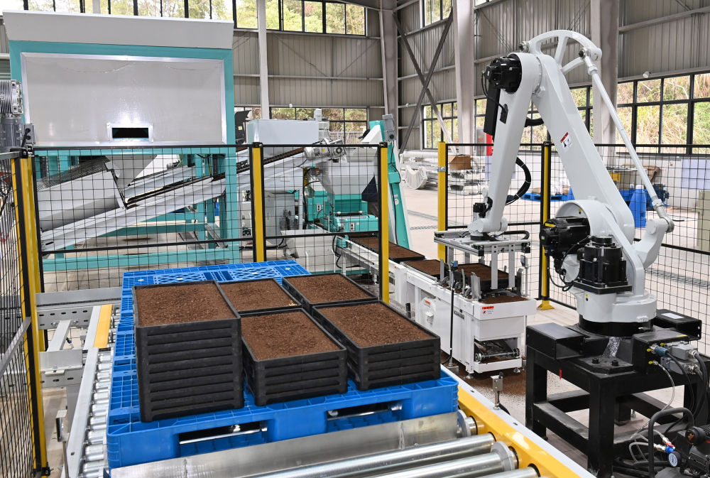 在浙江省東陽市皇野生態農業有限公司現代農事服務中心,全自動智能水稻育秧生產線在制作秧盤(2025年3月13日攝)。新華社發(包康軒 攝)