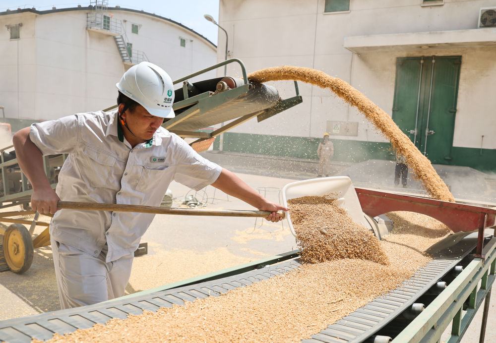 在江蘇連云港市連云區的中央儲備糧連云港直屬庫糧食收購作業區,工作人員用傳輸機傳送小麥入庫(2025年6月18日攝)。新華社發(王健民攝)