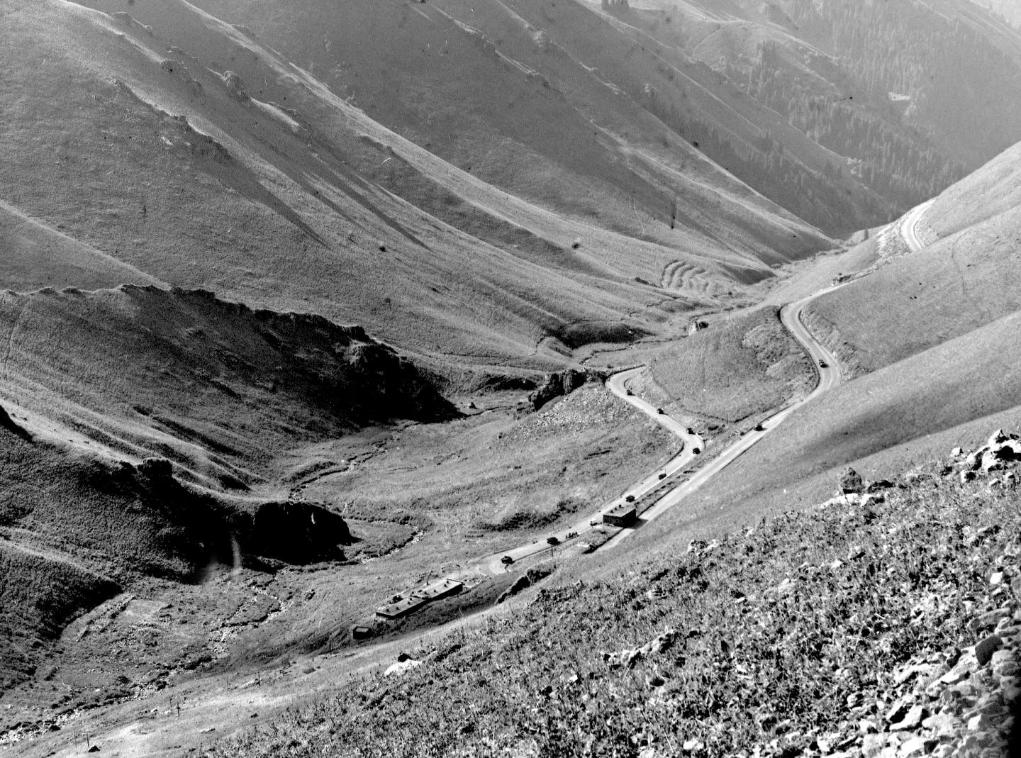 汽車行駛在蜿蜒曲折的獨庫公路天山峽谷地段(1983年9月26日發)。