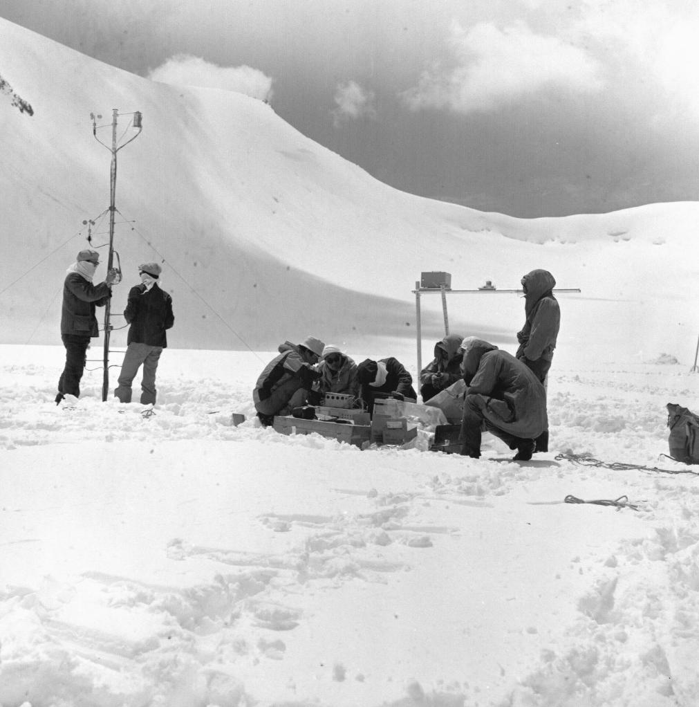 中日天山冰川氣象考察組正在1號冰川東支海拔4000米的冰表面安裝測試儀器(1983年7月20日發)。
