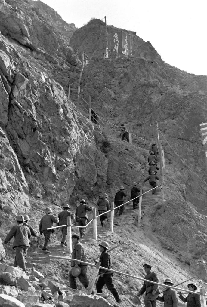 參加南疆鐵路建設的中國人民解放軍鐵道兵戰士攀登高山去修路(1978年11月9日發)。