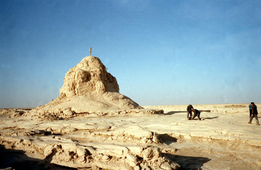科考隊員正在沙漠腹地進行實地考察(1988年1月12日發)。