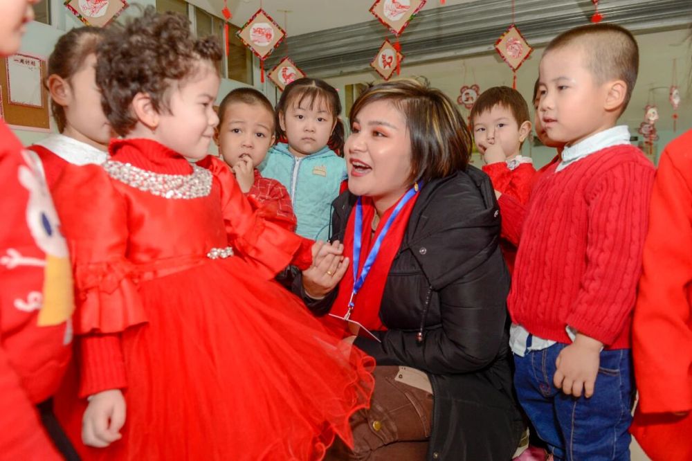 全國人大代表如克亞木(右三)在集中視察活動中,來到新疆鄯善縣中心幼兒園與孩子們交談(2019年2月14日攝)。新華社記者丁磊攝