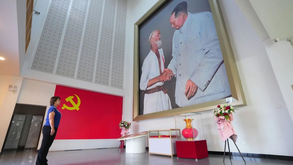 在新疆和田地區于田縣拍攝的毛主席接見庫爾班·吐魯木塑像(9月12日攝)。新華每日電訊記者丁磊攝