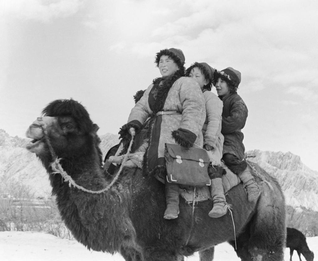 新疆烏恰縣的牧民騎駱駝上學(1954年發)。