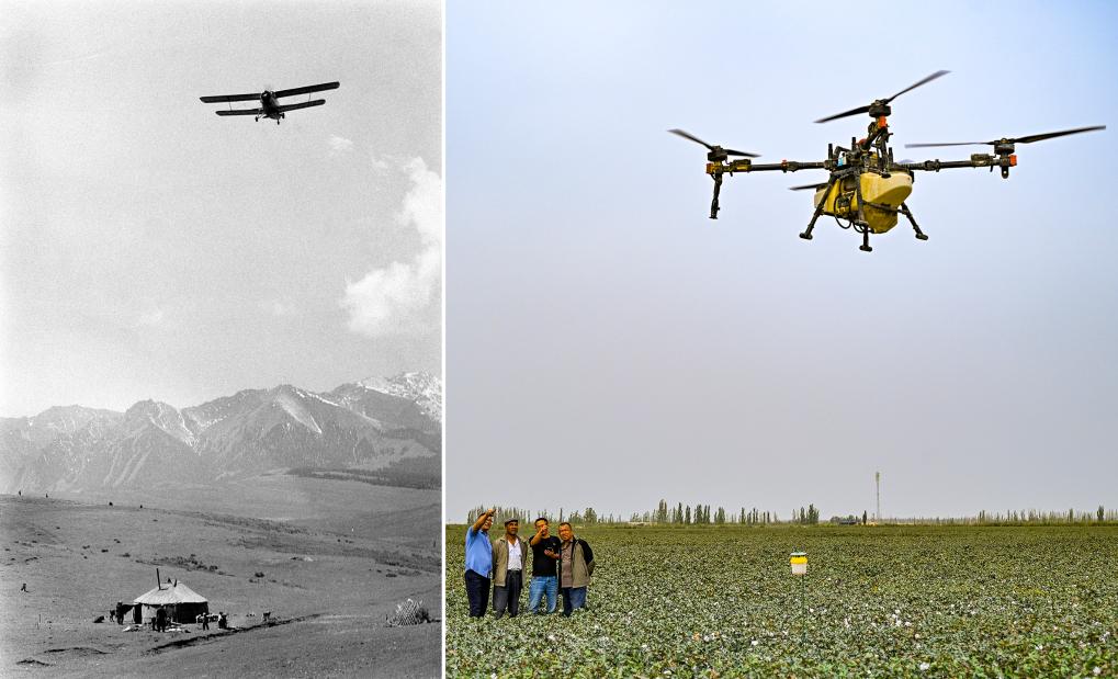 拼版照片,左圖為新疆民航局飛機正在草原上撒播草種(1981年6月12日發,新華社記者 武純展 攝);右圖為2025年9月19日,極飛超級棉田負責人艾海鵬(右二)在尉犁縣的示范棉田里為達西村村民進行智能無人機灑藥培訓。無人化智慧農場應用農業無人機、農業無人車、遙感無人機、農機自駕儀等系列物聯設備實施“水肥一體化”管理,農民用一部手機即可操作智能設備完成多項田間管理工作。(新華社記者 陳朔 攝)