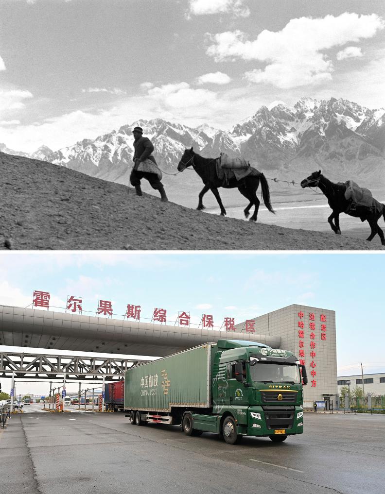 拼版照片:上圖為1960年,新疆塔什庫爾干塔吉克自治縣郵遞員艾再孜汗翻山越嶺,把郵件投送到帕米爾高原上的各個角落(新華社記者 武純展 攝);下圖為2025年9月11日,一輛運送郵件的郵車正駛出霍爾果斯綜合保稅區?;魻柟箛H郵件交換站于2022年7月正式運營,以進出口物流渠道為支持,為跨境電商產業鏈上下游提供倉儲和快遞物流綜合解決方案。承運中國至中亞多國、俄羅斯以及歐洲國家的出口國際郵件。3年來,累計國際郵件交換量2026噸(新華社記者 李賀 攝)。