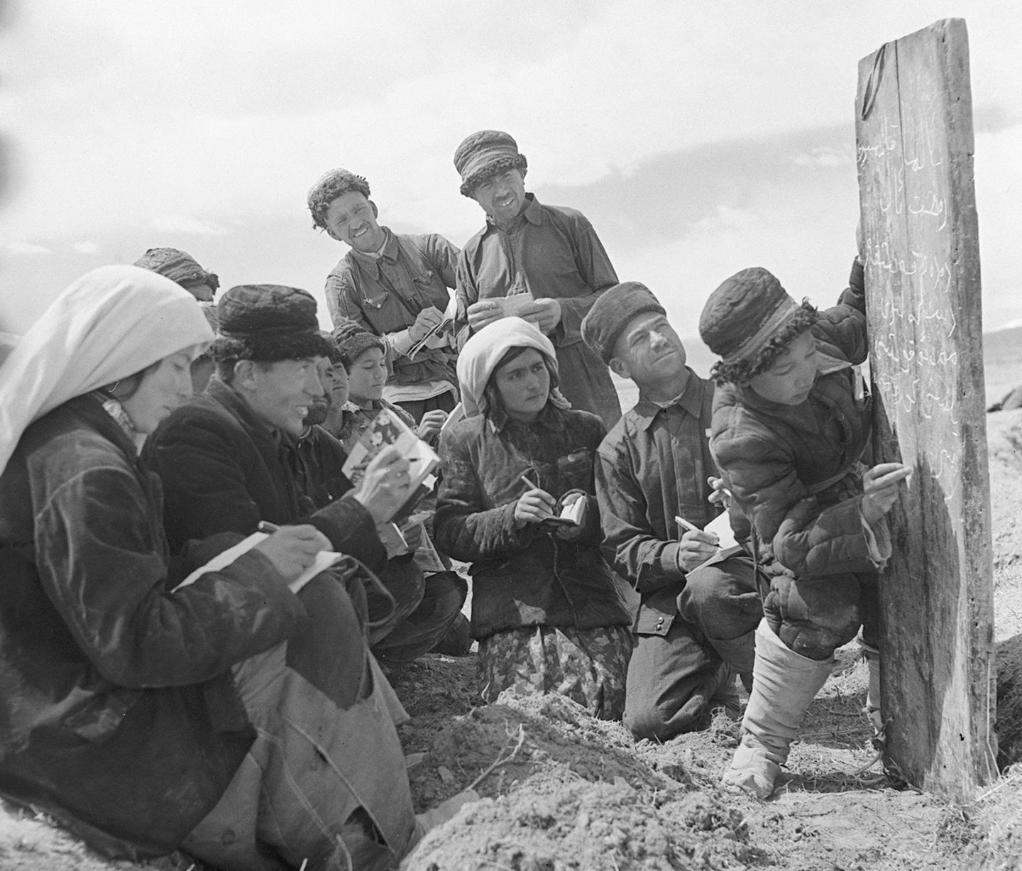 1960年,新疆塔什庫爾干塔吉克自治縣慕士塔格人民公社二大隊的社員在小學生的幫助下在田間學習文化。