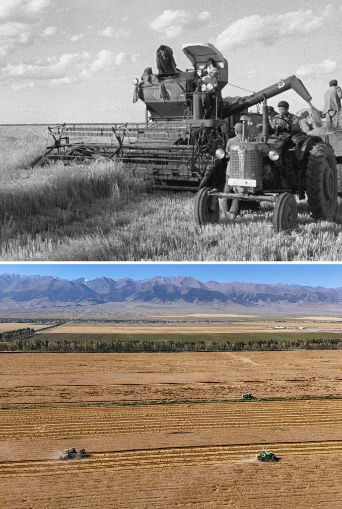 拼版照片,上圖為20世紀60年代初,新疆莫索灣墾區收割小麥的場景。(新華社記者 武純展 攝);下圖為2024年9月7日,收割機在新疆生產建設兵團第十三師新星市紅山農場收割小麥。(新華社記者 胡虎虎 攝)