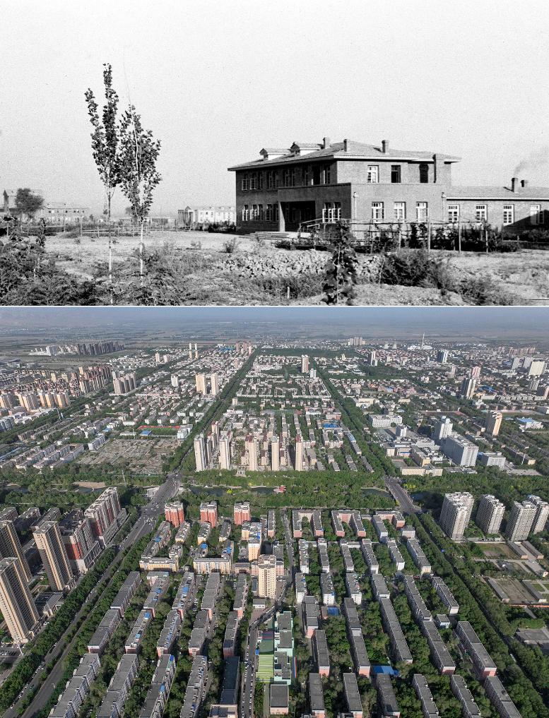 拼版照片:上圖為建設中的石河子新城(1953年9月發,新華社記者 武純展 攝);下圖為2024年5月15日拍攝的石河子市城區(新華社記者 胡虎虎 攝)。