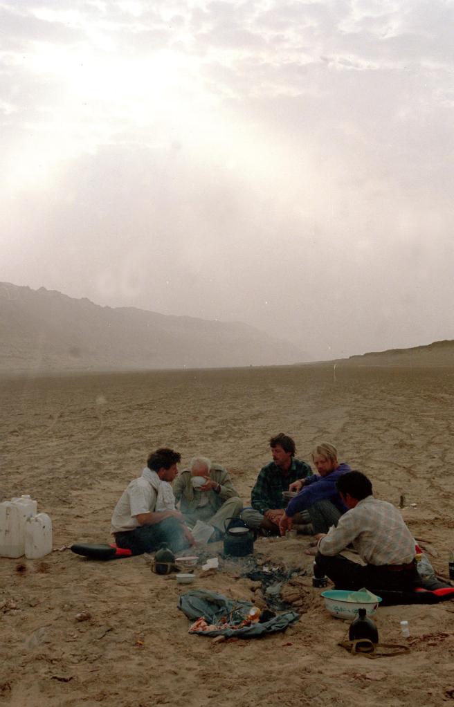 1988年9月,一支中法聯合科學考察隊對新疆南部和田地區的沙漠綠洲進行了為期52天的考察。這是中法聯合科考隊人員在新疆塔克拉瑪干沙漠麻扎塔格一帶風餐露宿。