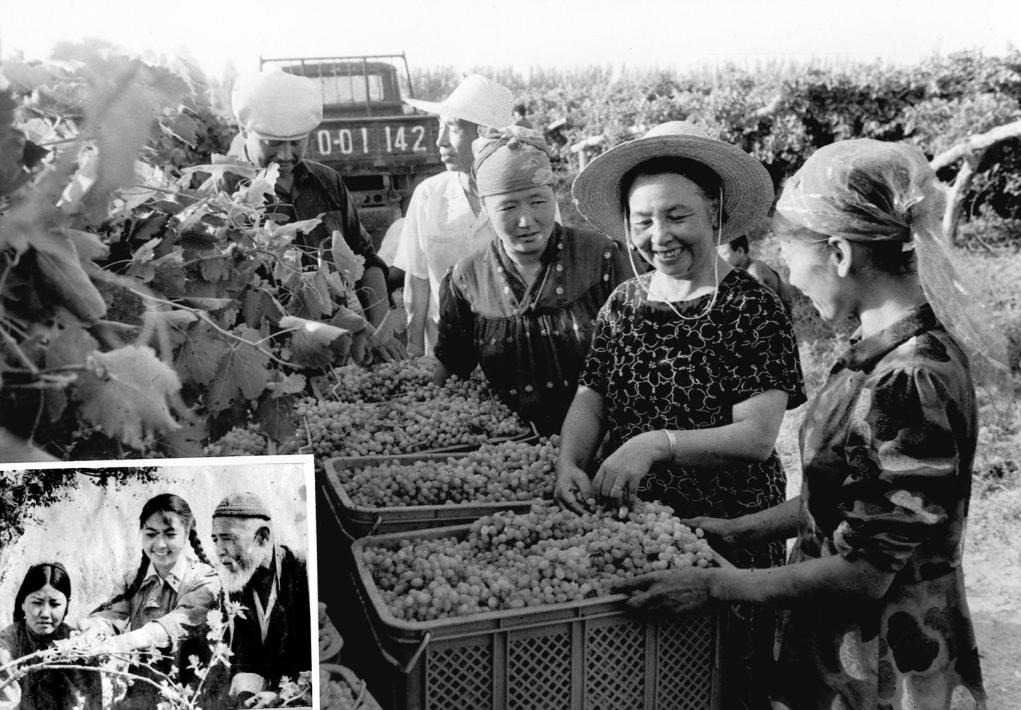 在新疆吐魯番拍攝的高級農藝師王惠珠(右上圖右二)。1954年,王惠珠來到吐魯番,投身于葡萄生產新技術推廣工作(左下圖中)。她在吐魯番安家落戶,為發展這里的葡萄生產奮斗了幾十年,退休后仍致力于葡萄品種的更新、改良和推廣(1990年10月16日發)。