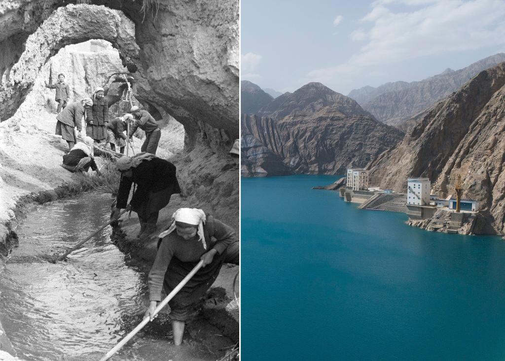 拼版照片:左圖為1963年新疆吐魯番群眾在整修坎兒井渠道。(新華社記者 武純展 攝);右圖為2025年8月7日拍攝的新疆目前規模最大的水利樞紐工程阿爾塔什水庫,該工程兼顧生態、防洪、灌溉、發電等功能,2021年8月建成投產以來,平均每年向塔里木河干流生態補水約3.3億立方米,徹底解決了葉爾羌河千年水患,每年減少約1000萬人次的防洪投入;同時為南疆提供清潔能源,改善了南疆的電力短缺狀況。(新華社記者 周佳誼 攝)