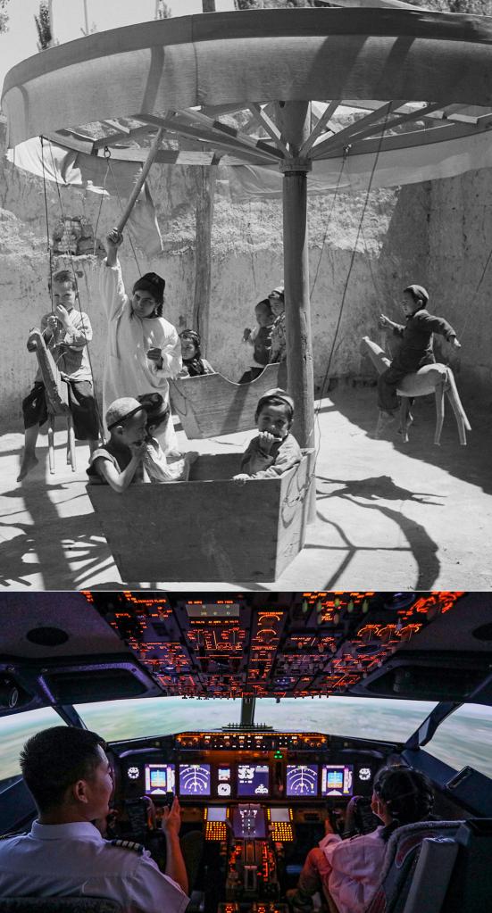 拼版照片,上圖為新疆維吾爾自治區喀什市郊區幼兒園的維吾爾族孩子們在游戲(1960年5月28日發,新華社記者 武純展 攝);下圖為2022年6月19日,在南航新疆基地,來自烏魯木齊市金太陽幼兒園的劉灼曦(右)在飛行教員的指導下,體驗雙座737IPT程序模擬機飛行。(新華社記者 王菲 攝)