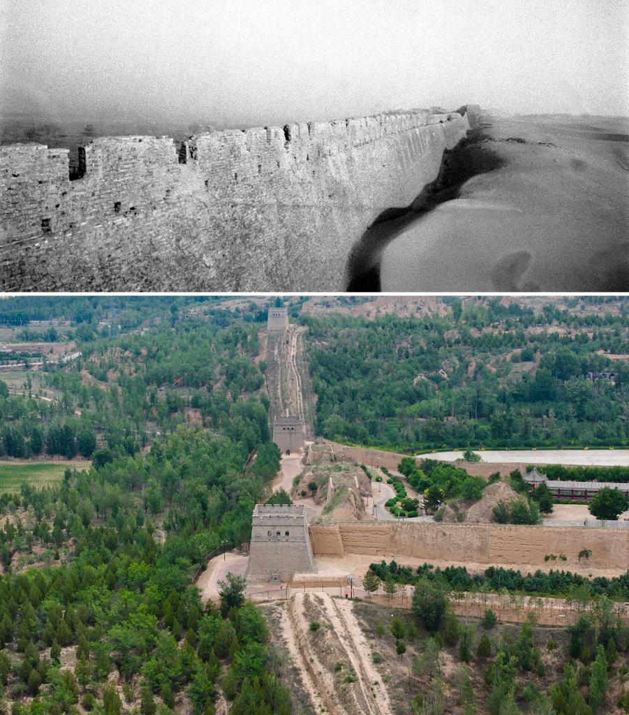 拼版照片,上圖:1953年,陜西省榆林縣常樂堡的西城墻被沙漠埋沒了大部分,有的地方沙漠甚至高出城墻一丈有余(新華社記者 武純展 攝);下圖:2024年6月6日拍攝的榆林鎮北臺附近的長城生態防護林帶(新華社記者 邵瑞 攝)。陜西省榆林市地處毛烏素沙地與黃土高原過渡地帶,曾飽受風沙與水土侵蝕危害。幾十年來,在一代代治沙人和水土保持工作者的努力下,通過大規模生態治理,榆林市的生態環境面貌發生了根本性變化。如今,榆林市860萬畝流沙全部得到固定或半固定,全市林木覆蓋率36%,累計治理水土流失面積1.8萬多平方公里,長城內外重新披上綠裝,“塞上明珠”煥發勃勃生機。
