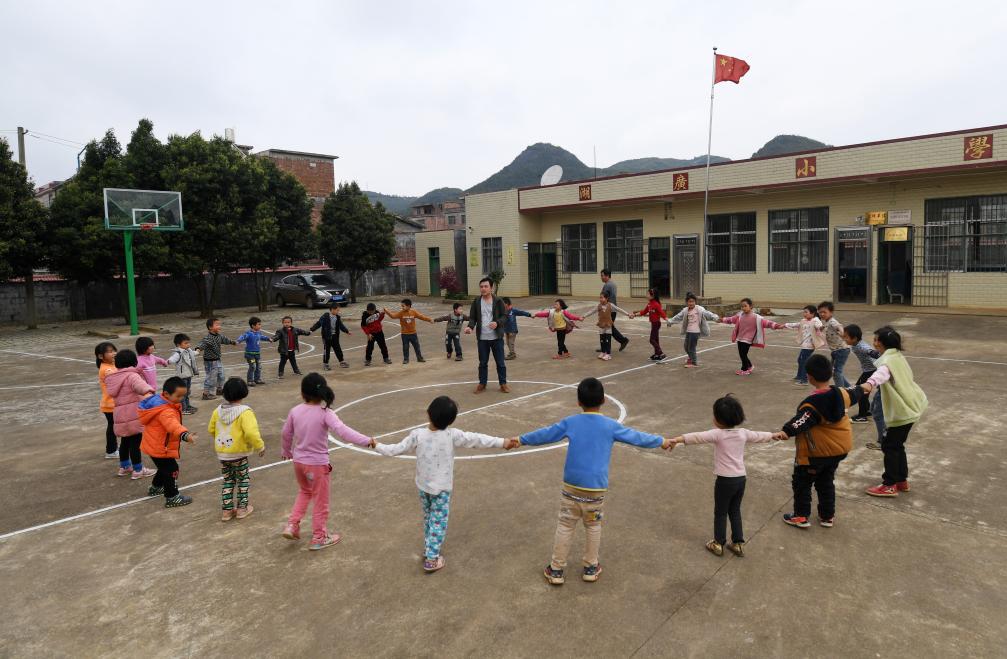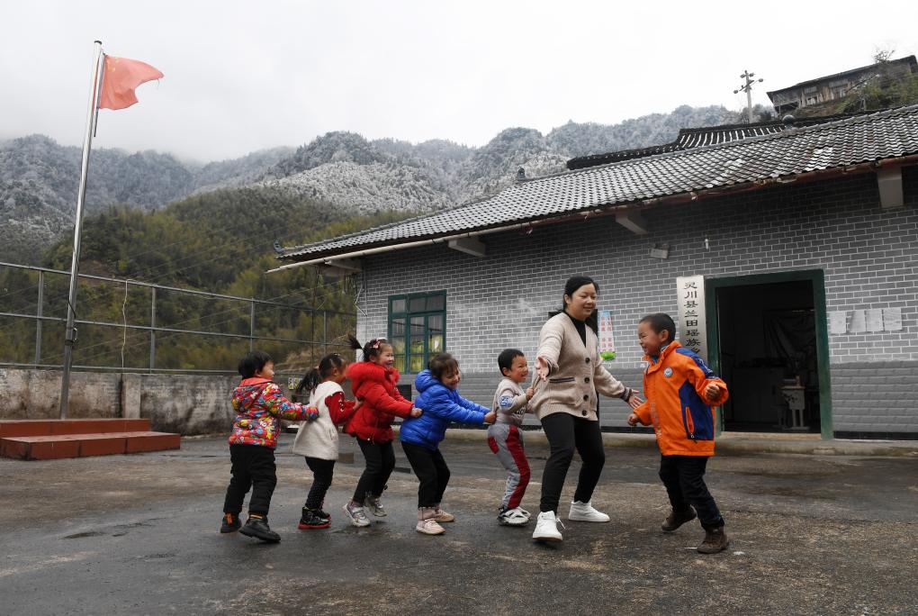 在廣西靈川縣蘭田瑤族鄉東良教學點,石夏月老師和學生在做游戲(2022年2月24日攝)。