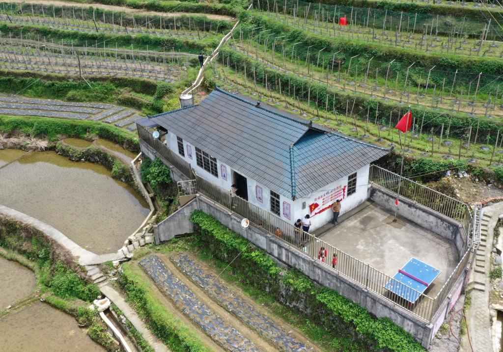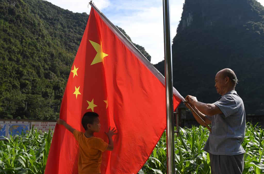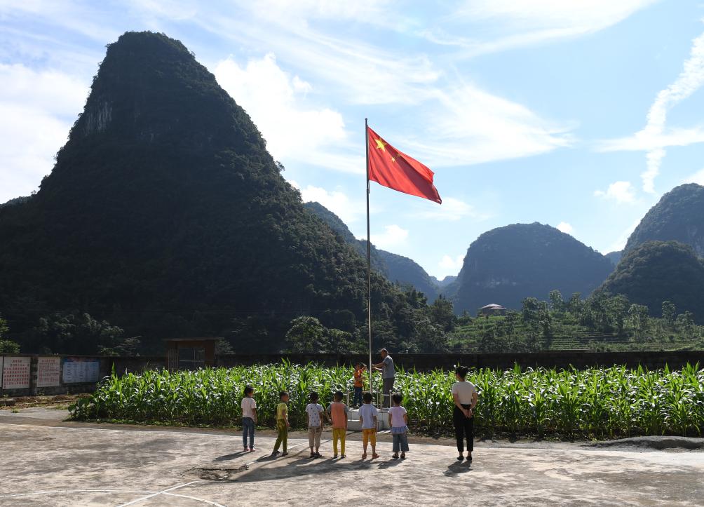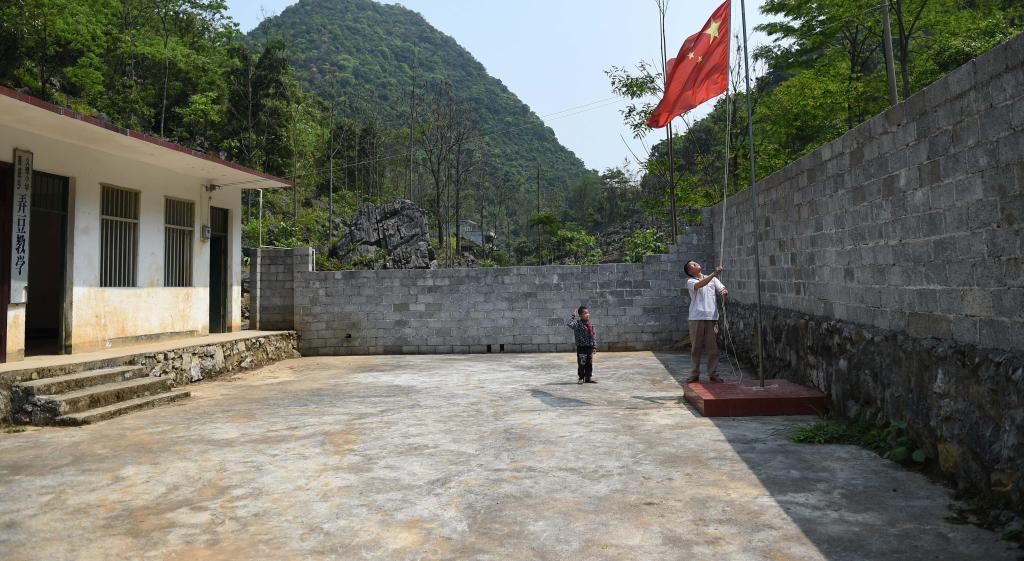 五星紅旗飄揚在廣西靈川縣蘭田瑤族鄉深潭教學點(2023年5月18日攝)。