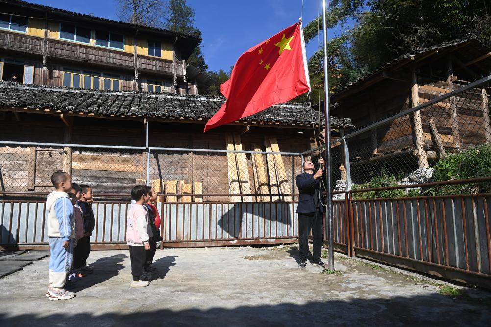 廣西龍勝各族自治縣龍脊鎮滿田小學的潘從漢老師和學生升國旗(2023年11月29日攝)。