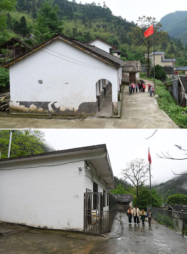 拼版照片。上圖:在廣西全州縣蕉江瑤族鄉苦馬田教學點,盧加紅老師和學生升國旗(2016年4月28日攝);下圖:黃利老師和學生從學校外走過(2025年4月24日攝)。