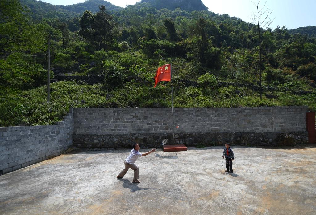 在廣西都安瑤族自治縣菁盛鄉義德小學弄豆教學點,藍啟飛老師(左)和學生藍孟源課后打羽毛球(2015年4月15日攝)。