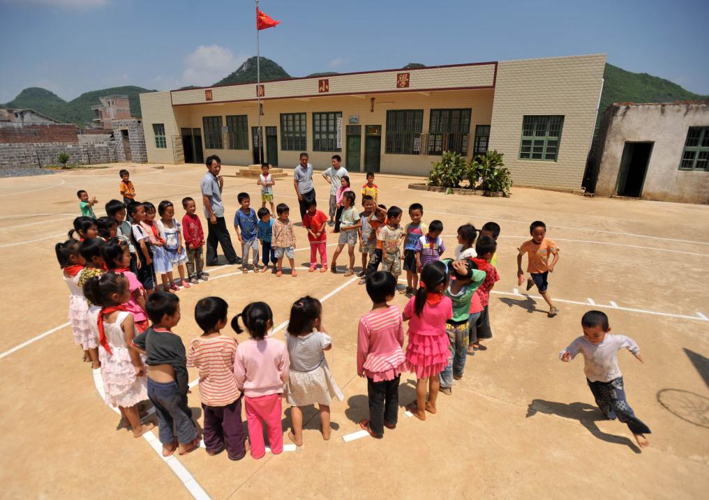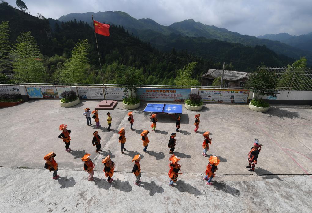 在廣西金秀瑤族自治縣忠良鄉山界教學點,學校唯一的老師陶鳳英領著學生做操(2019年6月4日攝)。