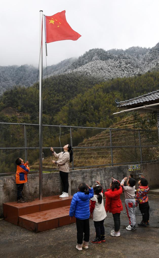 山頭白雪皚皚,檐下冰凌滴水。嚴寒的天氣里,一位老師領著六個學生在校園里唱國歌、升國旗,老師和一名學生作為升旗手,五名學生站成一排,向正在升起的國旗行隊禮和注目禮。升旗儀式結束后,國旗在校園上空高高飄揚,那抹最神圣的中國紅不僅溫暖了寒風中的學校,還溫暖了學校所在的山寨。