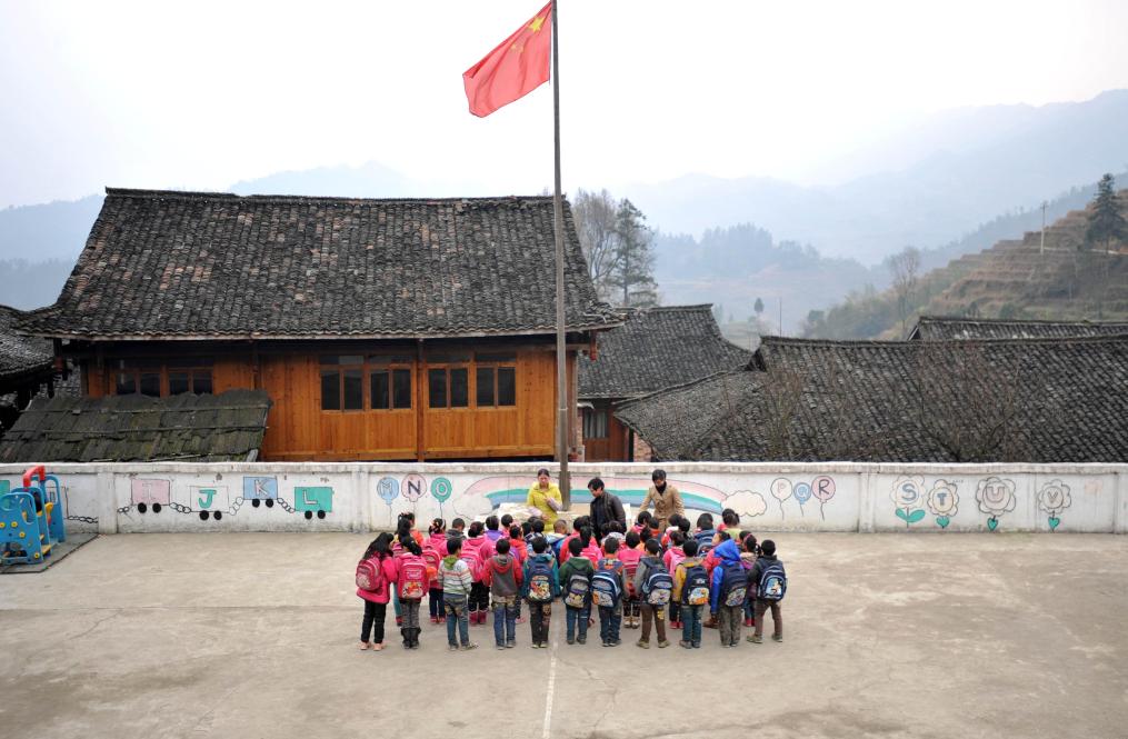 在廣西龍勝各族自治縣龍脊鎮江柳村翁江小學,余啟貴和孩子們在學校舉行升旗儀式(2013年2月26日攝)。