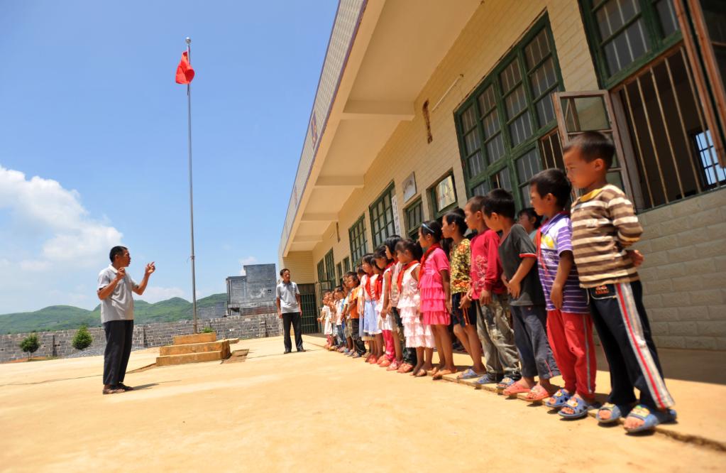 大山教學點,很多學校只有小學一到三年級學生,有的只有一、二年級幾個小孩。由于學生幼小,無法獨自擔當升旗手,很多老師不管年齡多大,都要自己擔當這個神圣的角色,扛起國旗站到旗桿下跟著國歌的節拍,拉著手中的繩子抬頭仰望國旗升起。