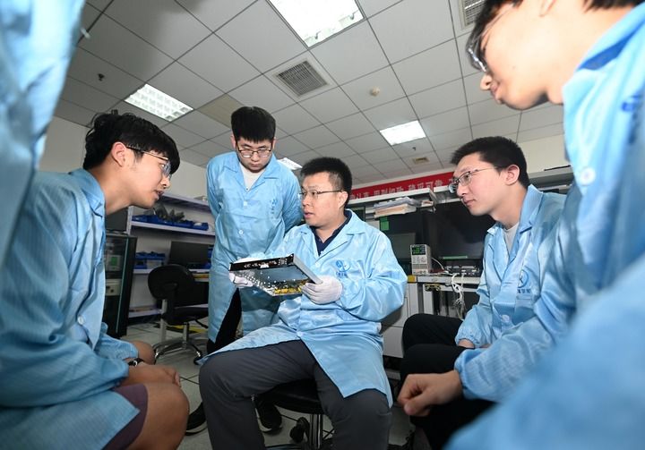 在云遙宇航的研發部,李峰輝(中)和團隊成員討論一款衛星核心部件的集成電路板(2024年6月4日攝)。新華社記者 趙子碩 攝