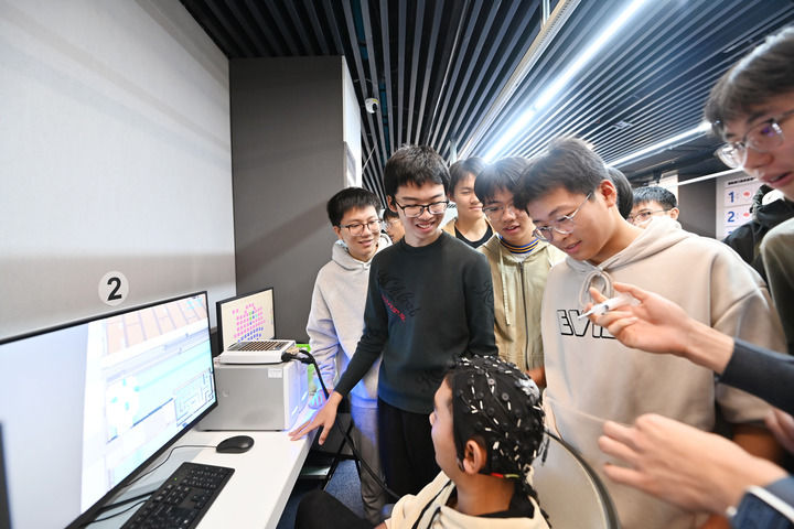 在天津大學腦機交互與人機共融海河實驗室里,學生王君策頭戴布滿傳感器的腦電帽,隨著不同頻率和音調的聲音響起,屏幕上跳躍出經算法解碼的腦電信號。他正在演示一場特殊的“聽力考試”。
