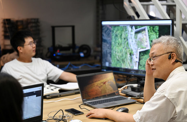 李哲(右)和學生在工作室內就拍攝的長城圖像進行交流(2023年7月25日攝)。新華社記者 李然 攝