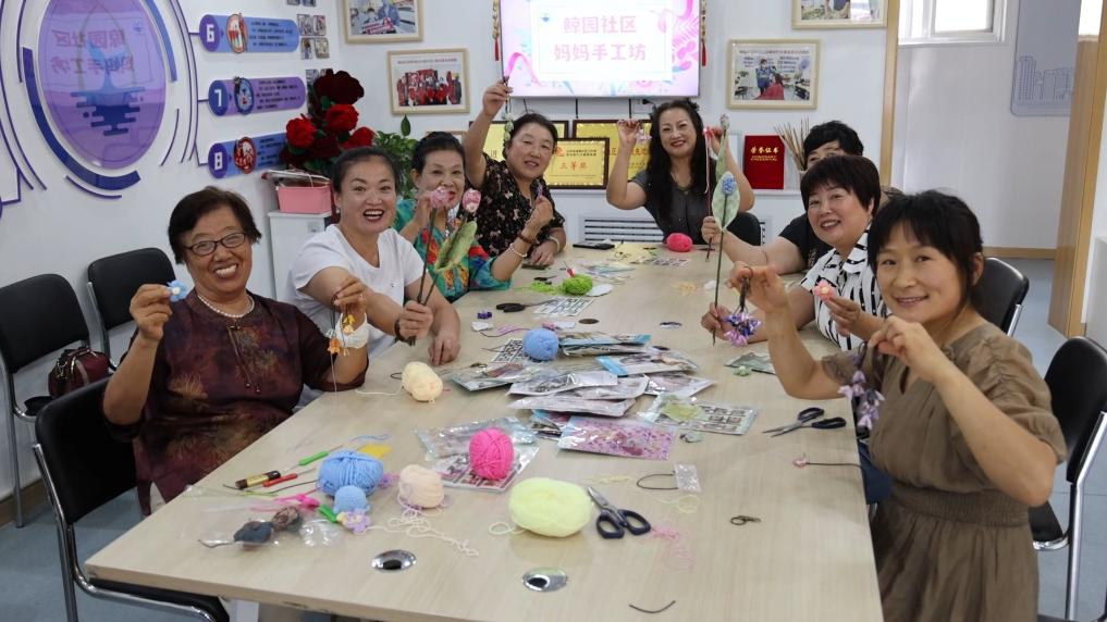 在山東省威海市環翠區鯨園社區,崔長艷正在給“媽媽手工坊”的學員上手工編織課。崔長艷自小喜愛做手工,2020年退休后來到社區組織的“媽媽手工坊”。