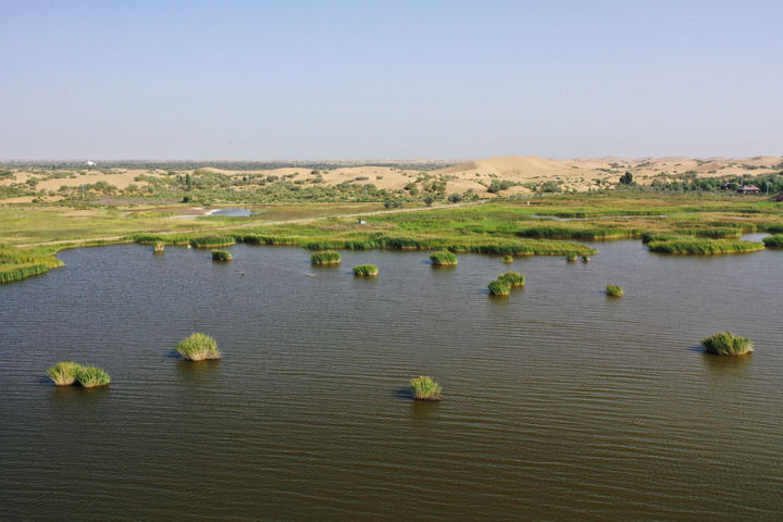 這是2025年9月3日拍攝的鄂爾多斯市杭錦旗境內庫布其沙漠里的七星湖景區(無人機照片)。新華社記者 李志鵬 攝