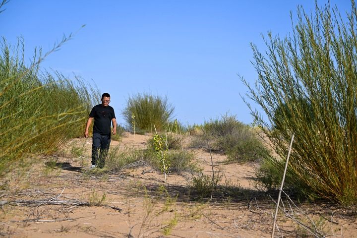 2025年9月10日,鄂爾多斯市達拉特旗治沙人馮慧在庫布其沙漠里查看沙生植物的生長情況。新華社記者 李志鵬 攝