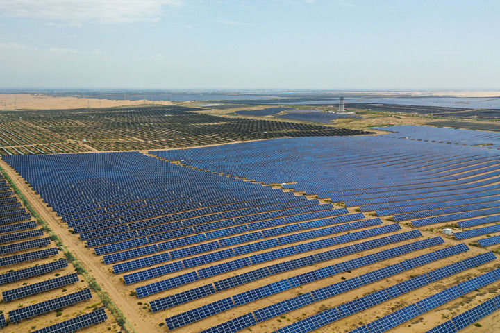 站在達拉特光伏發電應用領跑基地觀景臺,雄踞沙海的藍色光伏板一望無際,光伏板下沙生植被欣欣向榮?!拔覀兺ㄟ^摻拌紅泥和生物肥,改良了光伏區的土壤,為植物生長創造條件?!边_拉特旗能源局工作人員楊超說。