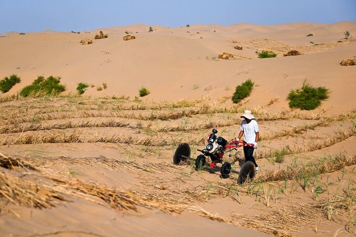 2025年9月12日,工人操作機械在鄂爾多斯市杭錦旗境內的庫布其沙漠里鋪設沙障。新華社記者 李志鵬 攝